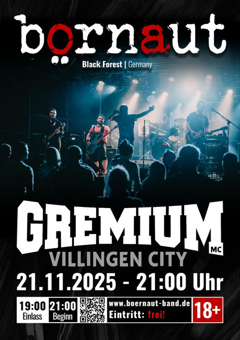 Nur zwei Wochen später geht’s weiter: Am 21.11.2025 stehen wir beim Gremium MC Villingen City auf der Bühne. Einlass ab 19:00 Uhr, Beginn 21:00 Uhr – und das Beste: Eintritt frei!
